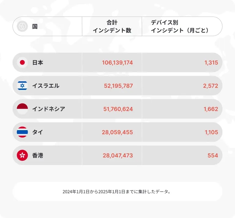 2024年には、日本国内で合計1億613万9174件のマルウェア感染が確認され、1デバイスあたりの月間感染件数は1315件に上る。