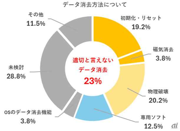 調査によると、データ消去方法について、「初期化・リセット」(19.2%)や「磁気消去」(3.8%)といった、同協会が「適正とは言えない」と指摘する方法を選択している教育委員会が合わせて23%に上った。