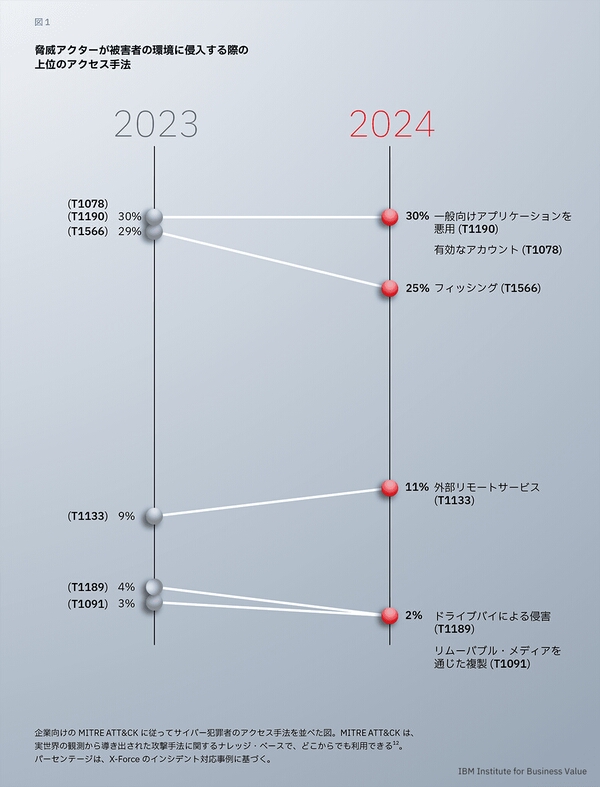 2024年のサイバー攻撃で最も顕著な変化は、侵入方法の主流がID情報の悪用に移ったこととされており、レポートによれば、脅威アクターが環境に侵入する際の手法として、「一般向けアプリケーションの悪用」と「有効なアカウントの利用」がそれぞれ30%を占め、トップとなっている。
