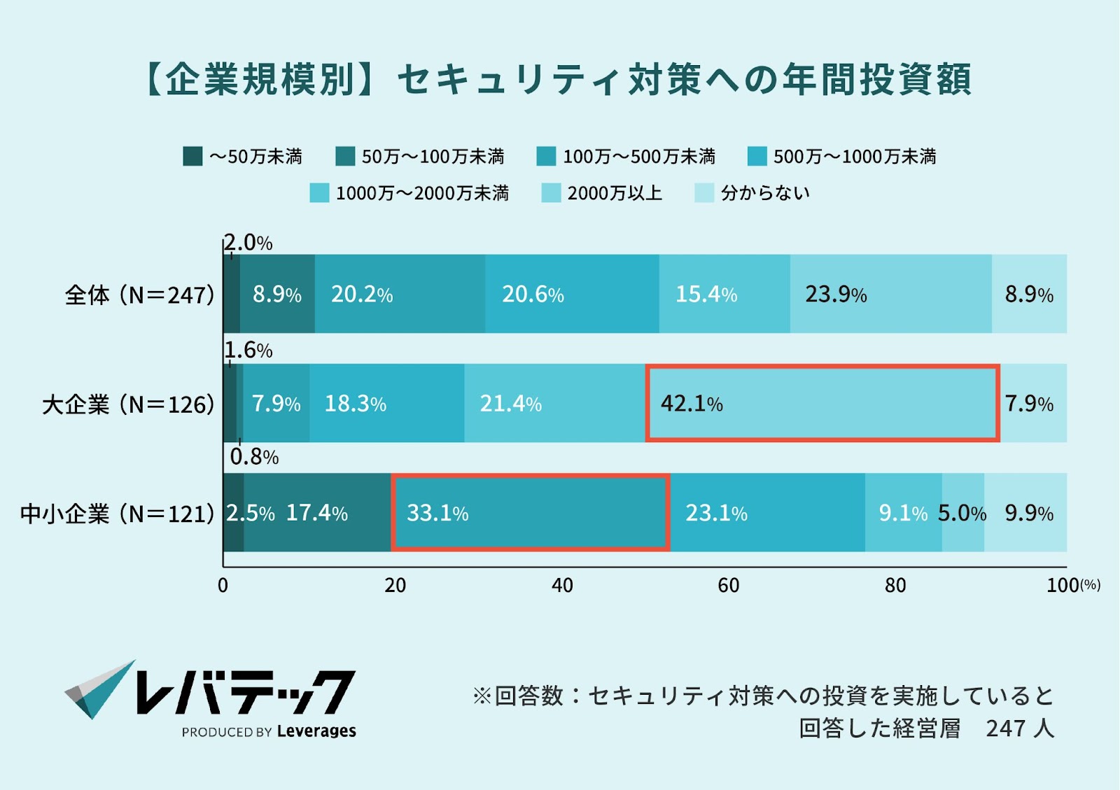 年間投資額を見ると、企業規模による「セキュリティ格差」が鮮明で、従業員1,000人以上の大企業では、年間「2000万円以上」を投資する企業が42.1%と最も多いのに対し、中小企業では「100万~500万円未満」が33.1%で最多となっている。