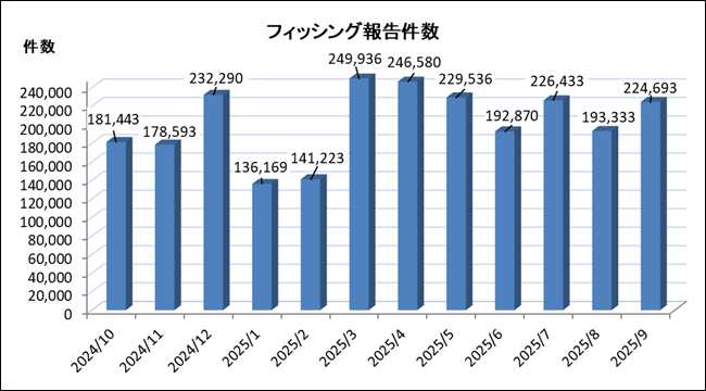 フィッシング対策協議会は、2025年9月に寄せられたフィッシング詐欺の報告件数が22万4,693件に達したと発表。