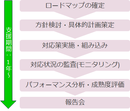 サイバーセキュリティ対策状況の現状把握や対策の優先順位付けを行い、サイバーセキュリティ対策のロードマップを策定します。