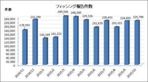 2025年10月のフィッシング詐欺報告件数が225,796件に上り、前月から約0.6%増加したことが、フィッシング対策協議会のまとめで明らかになった。