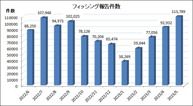 5月中に寄せられたフィッシング関連の報告件数は113,789 件で、前月比で20,857 件増加している。