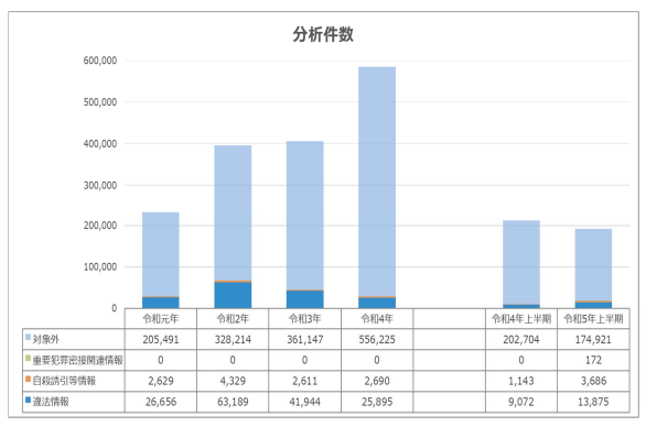 1月から6月までの期間、当該業務に運用されている「インターネット・ホットラインセンター」での通報件数は192,591件となっており、前年比で違法情報は4,830件、自殺誘引情報は2,543件それぞれ増加した。