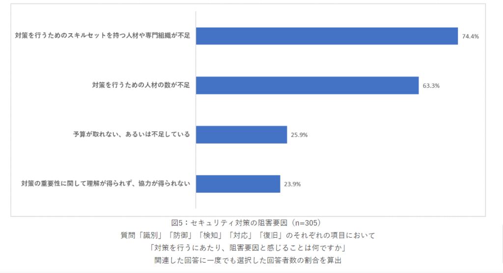 また、主なセキュリティ対策の阻害要因として「セキュリティ人材のスキル不足」との回答者が74.4%となり、人材不足とその対策が共通の課題とみられている。
