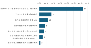 最も多かったトラブルは「詐欺サイトに騙されそうになった・実際に騙された」で、特に男性や長時間利用する層で経験率が高い結果が報告されている。