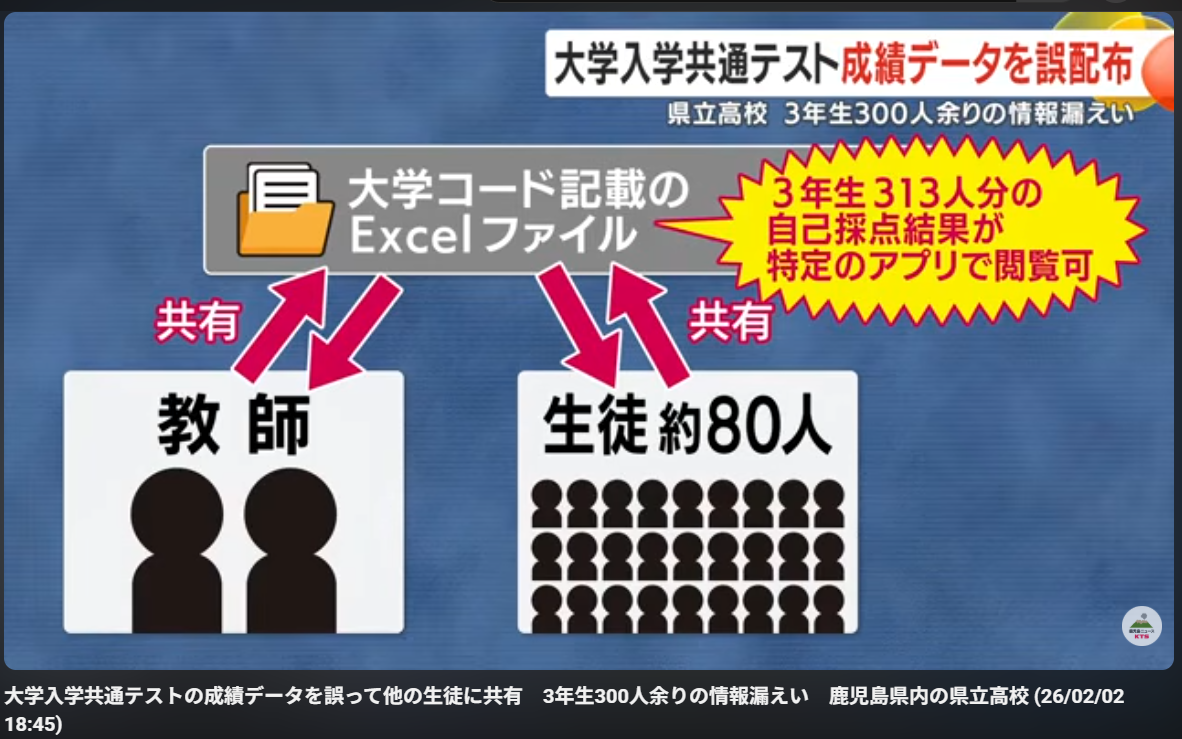 2026年1月30日、鹿児島県内の県立高校で、大学入学共通テストの自己採点結果313名分が誤って校内の他の生徒に共有される事案が発生した。