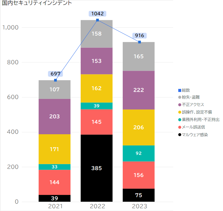 調査の対象は、2021年から2023年までの国内組織における事例をもとに集計されており、2023年の国内セキュリティインシデント総数は916件となっている。