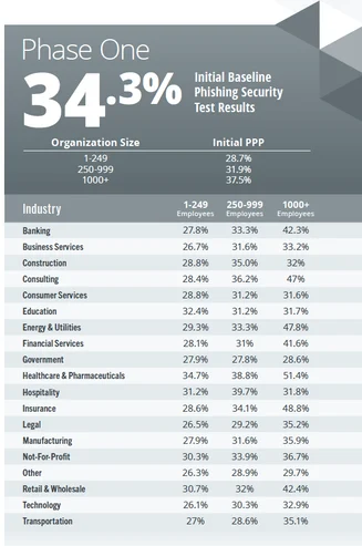 その結果、KnowBe4のセキュリティトレーニングを受けていない従業員のベースラインPPP(フィッシング詐偽ヒット率)は平均34.3%だった。