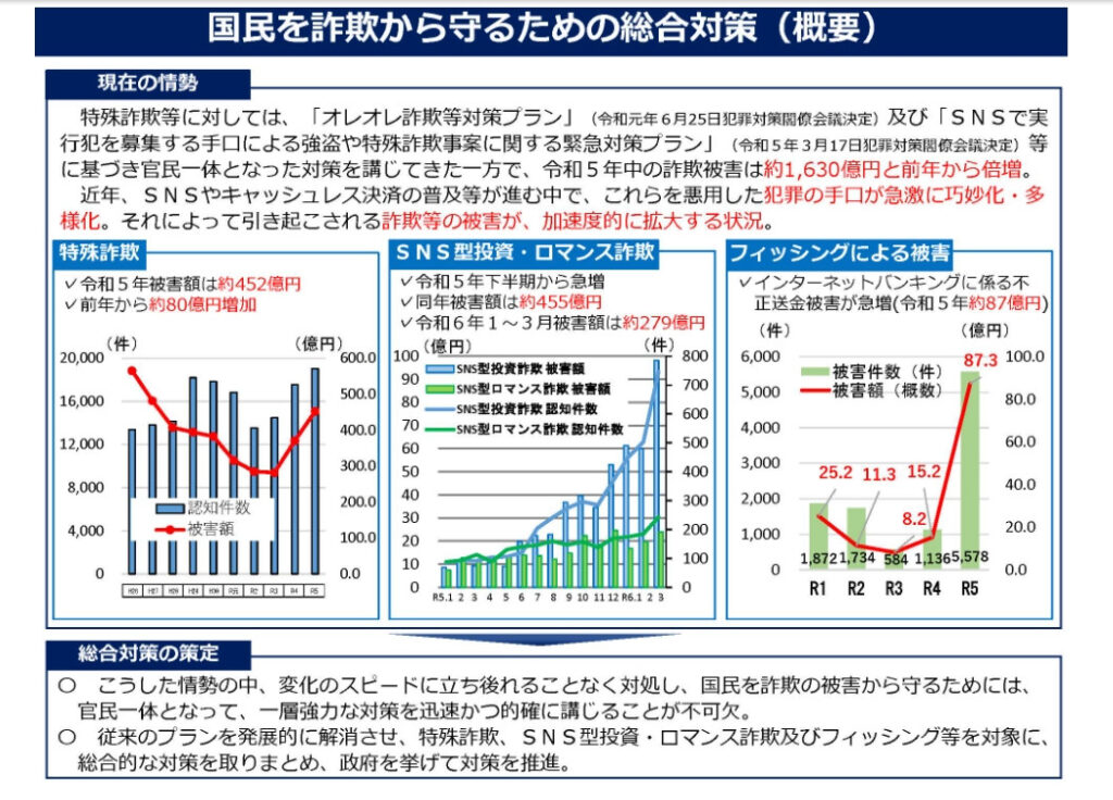 岸田総理は、「国民の大切な財産を守り抜くため、政府として初めて詐欺全般に特化した総合対策を取りまとめました」と述べ、関係者に対し、総合的な対策を推進するよう呼びかけている。