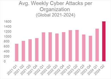 2024年第2四半期におけるサイバー攻撃は前年比で30%増加し、1組織あたり週1,636件の攻撃が発生。