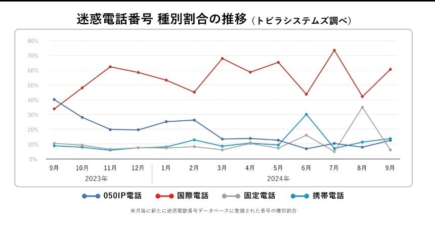 2024年9月に新たに迷惑電話番号として登録された国際電話の割合は、前月から18.4%増加しており全体の60.6%を占めた。