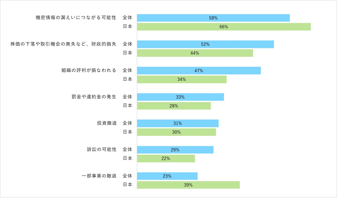 AIを利用したサイバー攻撃に対して適切な対策を講じなかった場合の影響について尋ねたところ、最も多かった回答は「機密情報の漏えいにつながる可能性」(全体:58%、日本:66%)だった。